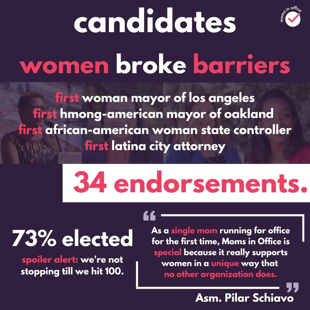 Each election cycle since 2020, women broke barriers. Moms broke barriers. Moms in Office is incredibly proud to have been integral to the campaigns of women across California and across the nation.